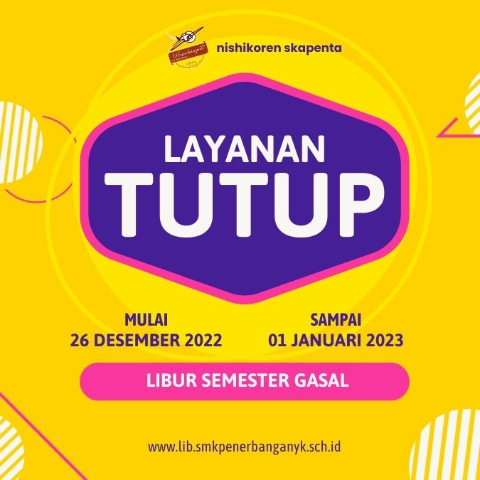 Diberitahukan kepada seluruh pengunjung Perpustakaan Nishikoren Skapenta, SMK Penerbangan AAG Adisutjipto, Bahwasanya mulai tanggal 26 Desember 2022 – 1 Januari 2023 Layanan Perpustakaan untuk sementara TUTUP. Dikarenakan libur semester gasal. Demikian informasi ini kami sampaikan. terima kasih
